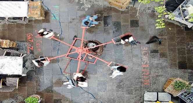 Kayseri’de 1980 ve 1990’lı yıllarda kullanılan eşyaların konsept olarak kullanıldığı çayevine getirilen seyyar salıncak ile çocuklar keyifli vakit geçiriyor.